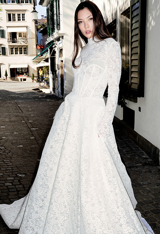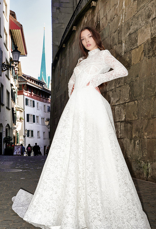 Este vestido captura la elegancia clásica con una interpretación contemporánea. Confeccionado en encaje completo, presenta una imponente silueta en A que estructura la figura con delicadeza y movimiento. El corpiño tipo corsé con varillas visibles realza la cintura y aporta una estética arquitectónica sutil, mientras el cuello alto y las mangas largas en encaje semi transparente evocan distinción.
